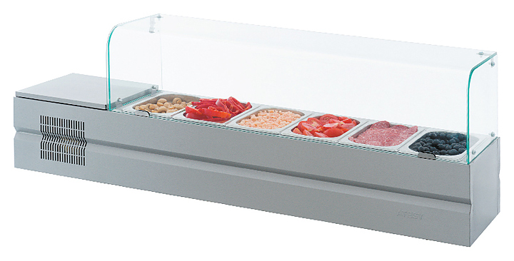 Настольная витрина Болоньезе-6 предназначена для кратковременного хранения и демонстрации компонентов пиццы (топингов).Данная витрина изготовлена из нержавеющей стали, предназначена для установки гастроемкостей. Температурный режим витрины +2°…+6°С обеспечивает долгую сохранность компонентов пиццы. Легкий доступ к гастроемкостям помогает легко и быстро начинить пиццу, а стильный дизайн позволяет витрине вписаться в любой интерьер.Важной особенностью этих витрин является специальная система охлаждения, захолаживающая объем с трех сторон.Для дополнительного удобства витрины снабжены выносным дополнительным столиком размером 300х300мм. В комплект входят гастроемкости GN 1/4 х 150 в количестве 6 шт